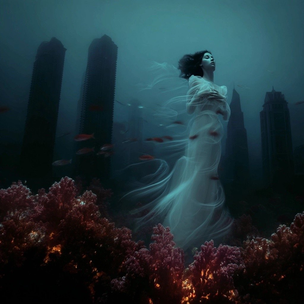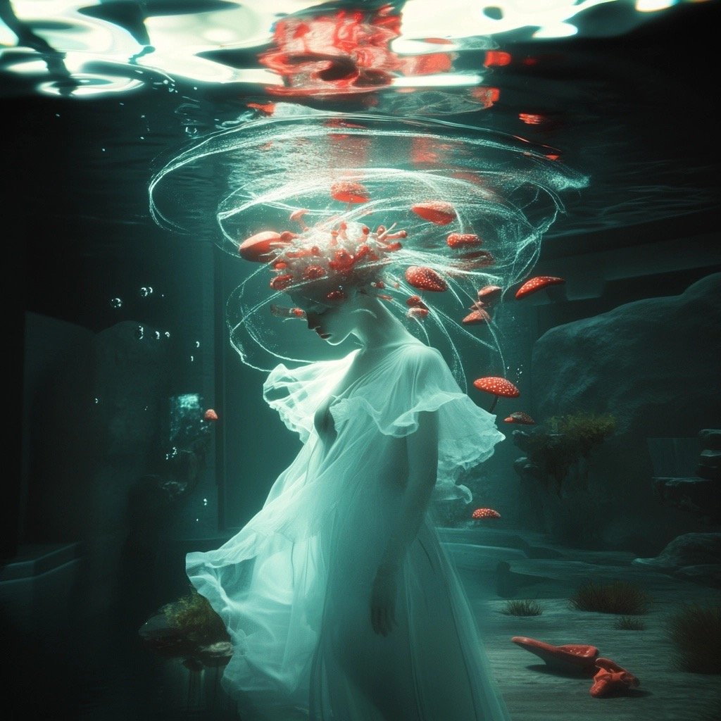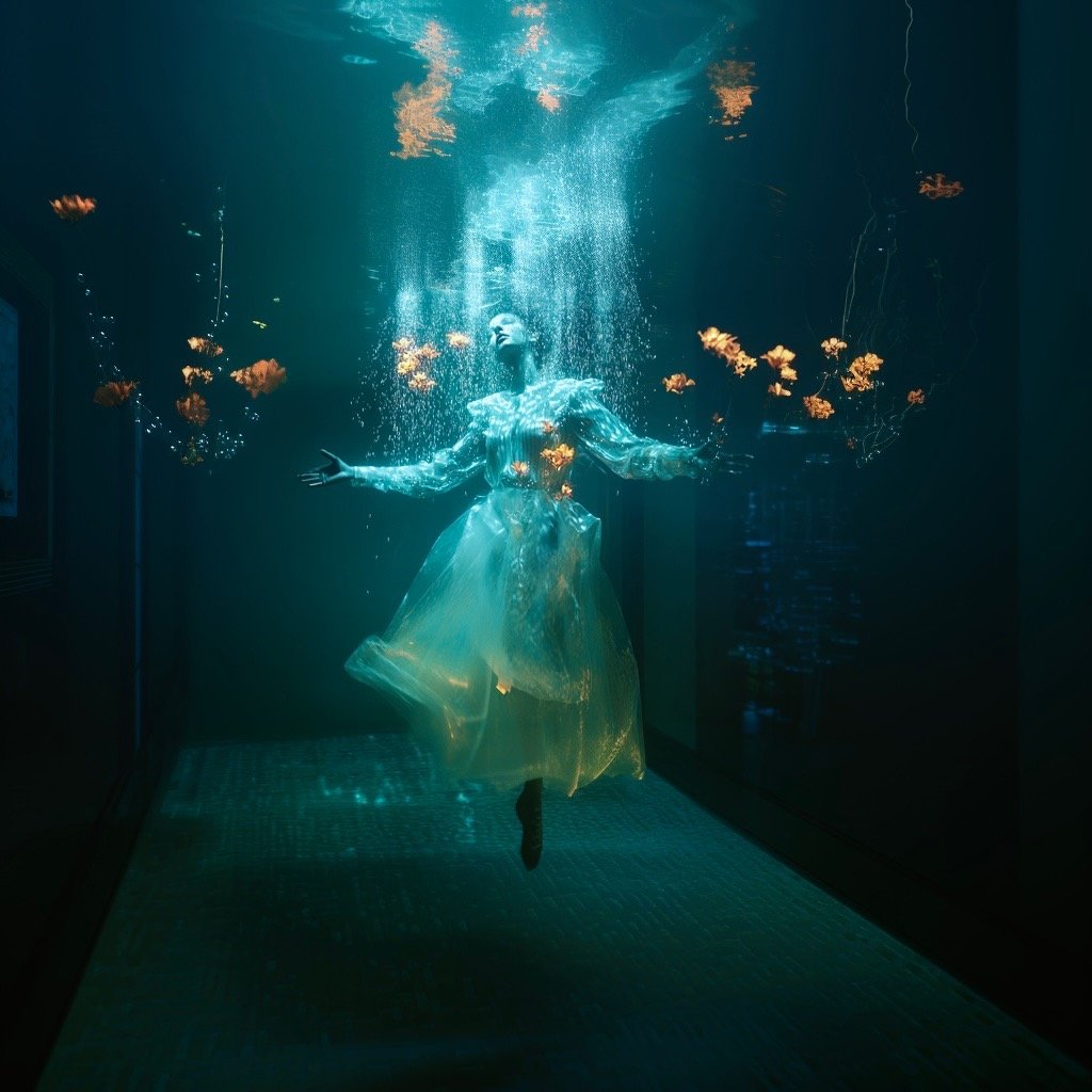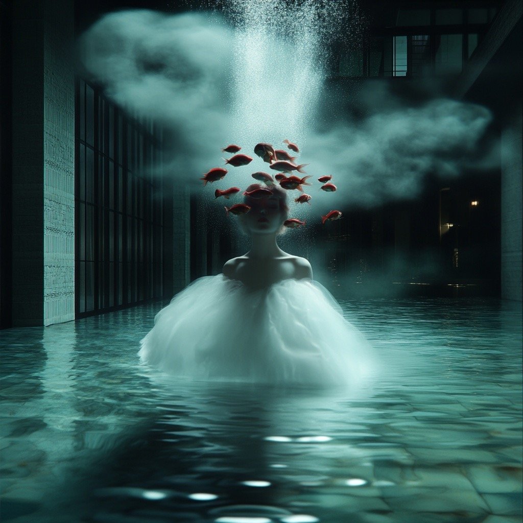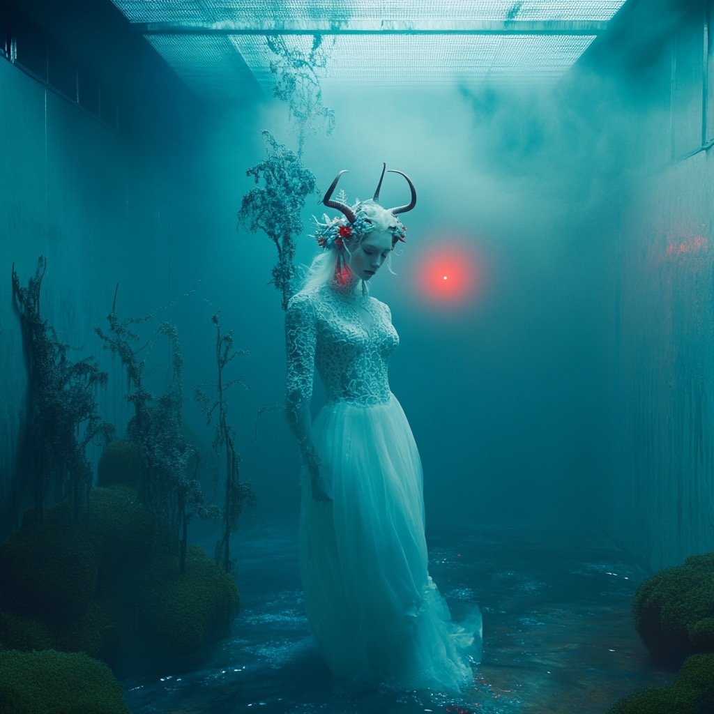 Αντλώντας από μυθολογικά αρχέτυπα των νυμφών του νερού και των πνευμάτων του τόπου, η έκθεση εξερευνά τη θηλυκότητα όχι ως υποκείμενο, αλλά ως μια ακατάλυτη δύναμη που επιβιώνει περισσότερο από τις δομές που χτίστηκαν για να την περιορίσουν. Αυτές οι φασματικές παρουσίες περιηγούνται σε δωμάτια όπου η ανθρώπινη φιλοδοξία έχει διαλυθεί σε κρύα και διαρκώς κινούμενα νερά, εκεί όπου το τεχνητό φως τρεμοπαίζει πάνω στην οργανική ανάπτυξη. Είναι μάρτυρες της παροδικότητας, ενσαρκώσεις αυτού που παραμένει όταν όλα τα άλλα καταρρέουν.