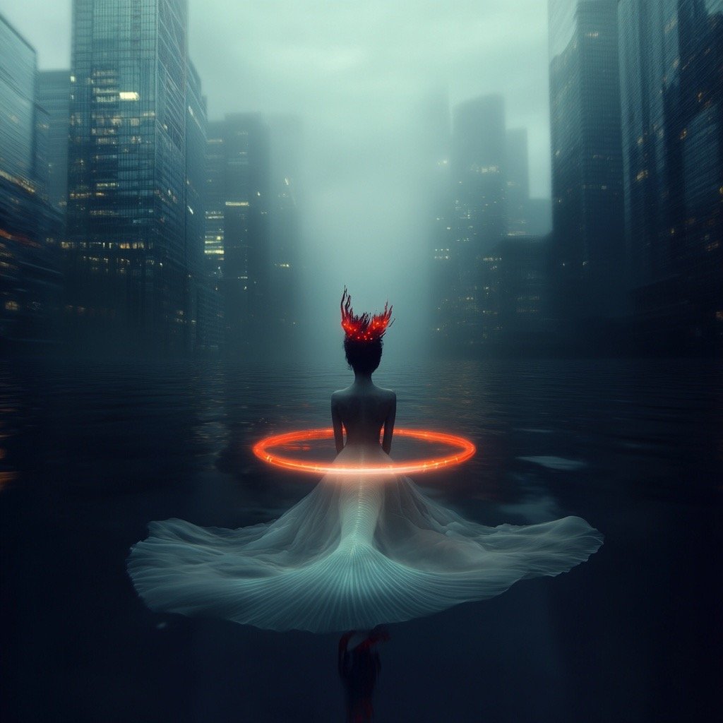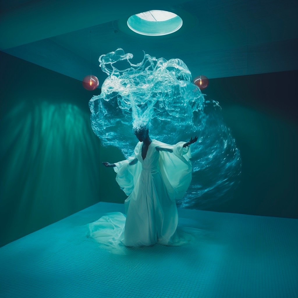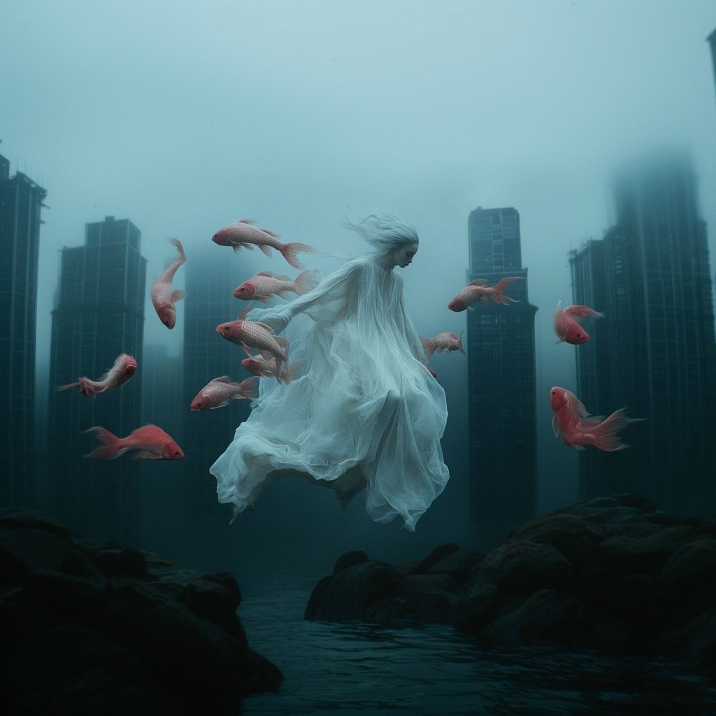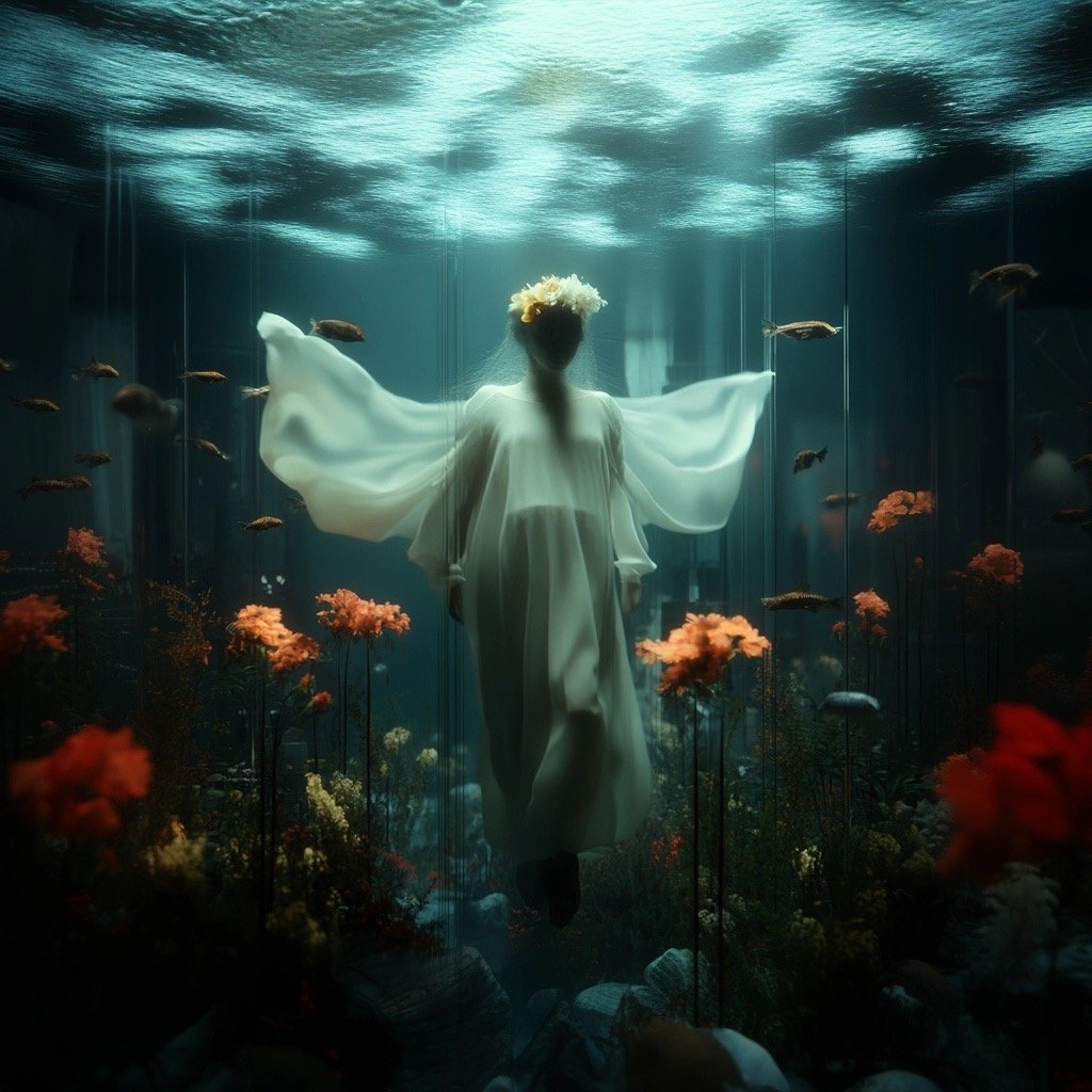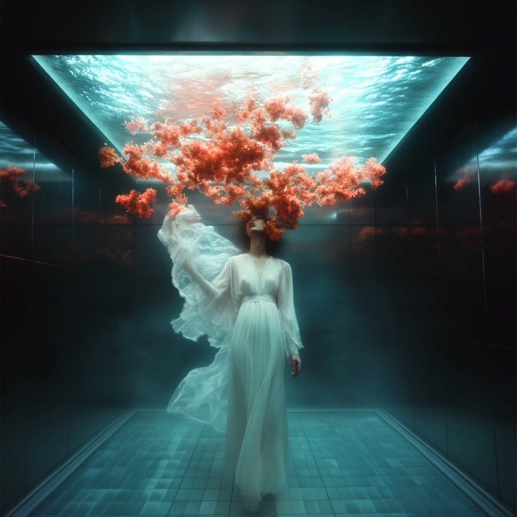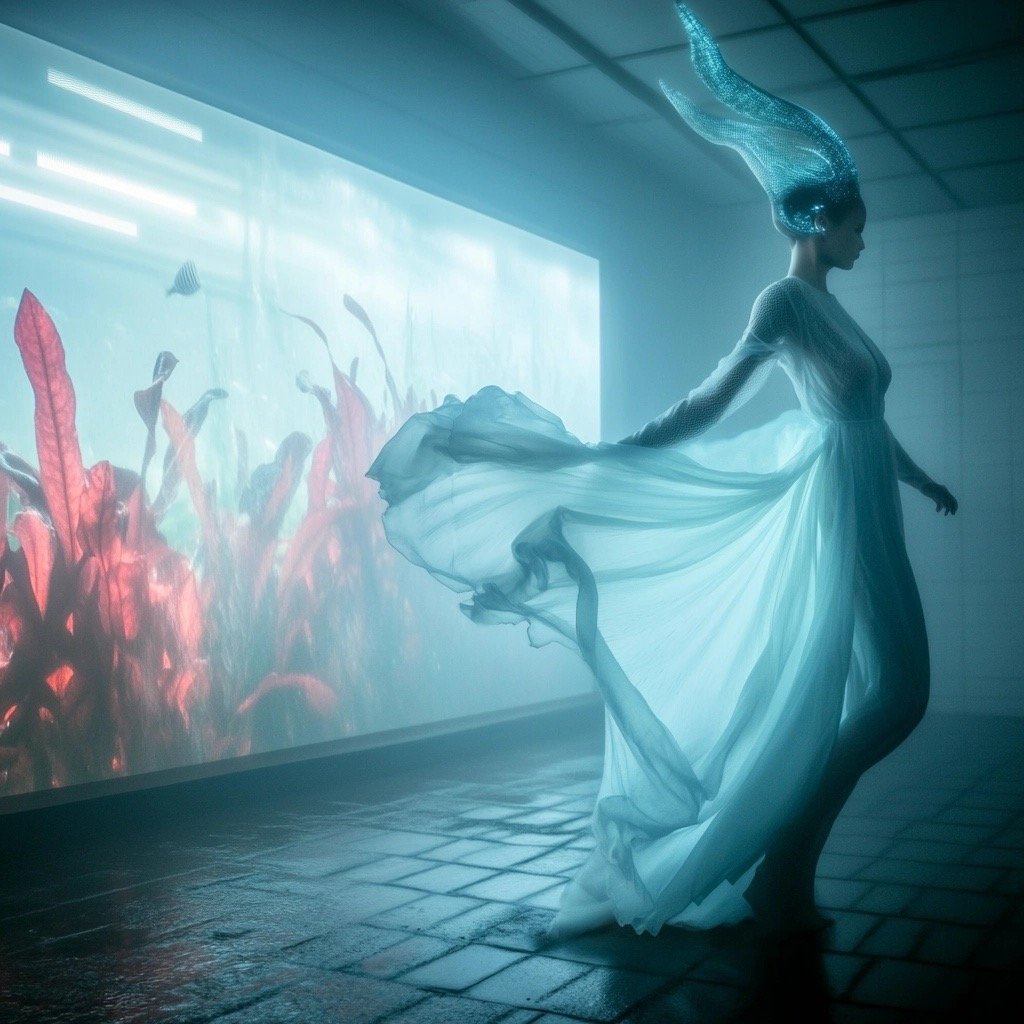 Αντλώντας από μυθολογικά αρχέτυπα των νυμφών του νερού και των πνευμάτων του τόπου, η έκθεση εξερευνά τη θηλυκότητα όχι ως υποκείμενο, αλλά ως μια ακατάλυτη δύναμη που επιβιώνει περισσότερο από τις δομές που χτίστηκαν για να την περιορίσουν. Αυτές οι φασματικές παρουσίες περιηγούνται σε δωμάτια όπου η ανθρώπινη φιλοδοξία έχει διαλυθεί σε κρύα και διαρκώς κινούμενα νερά, εκεί όπου το τεχνητό φως τρεμοπαίζει πάνω στην οργανική ανάπτυξη. Είναι μάρτυρες της παροδικότητας, ενσαρκώσεις αυτού που παραμένει όταν όλα τα άλλα καταρρέουν.
