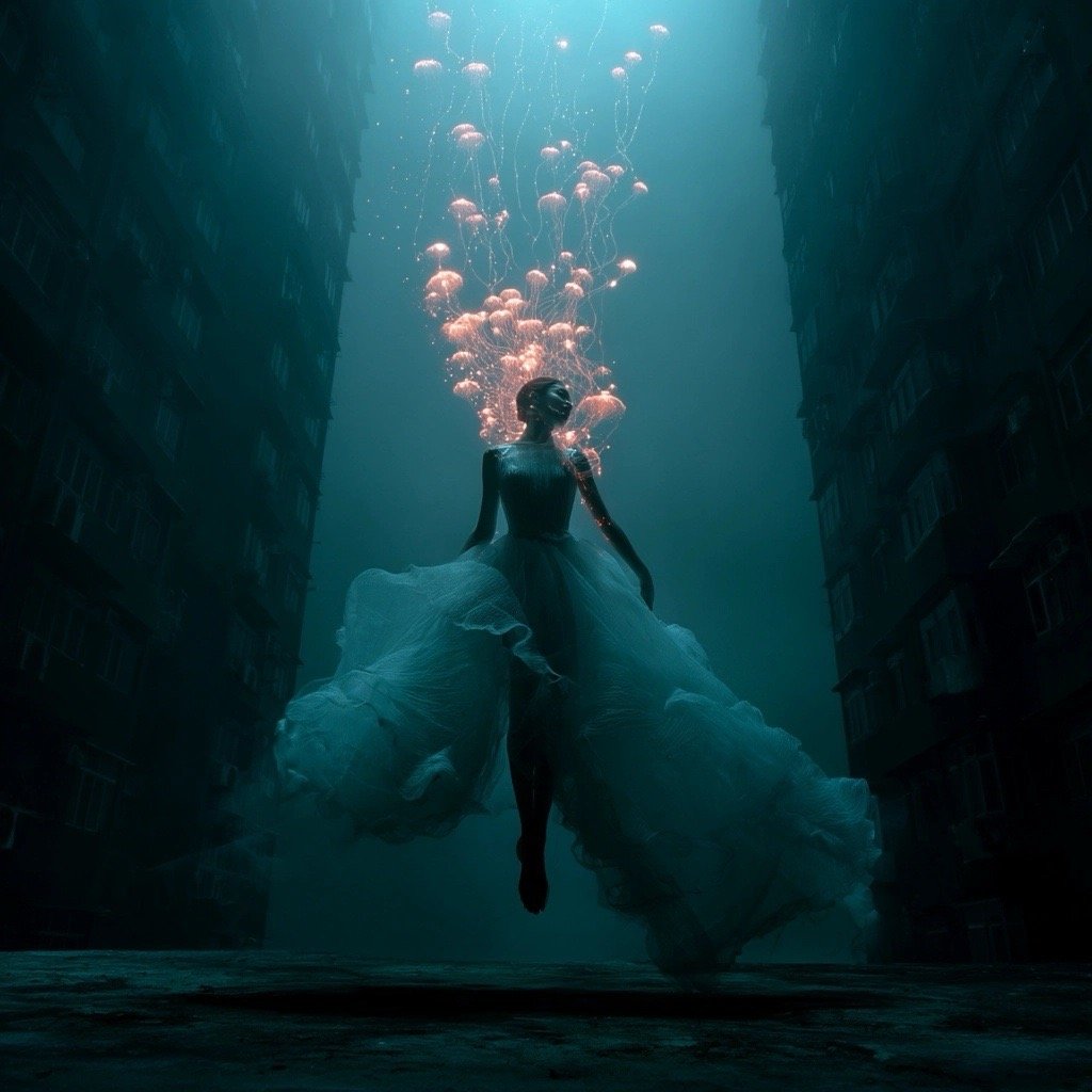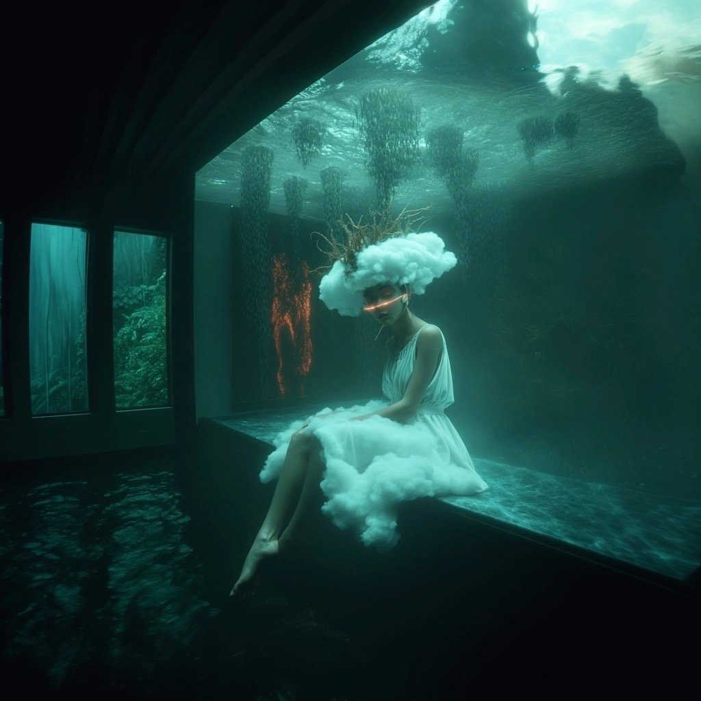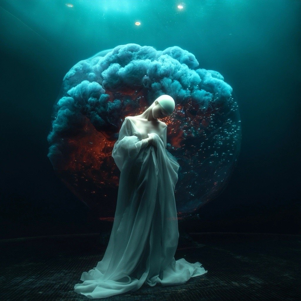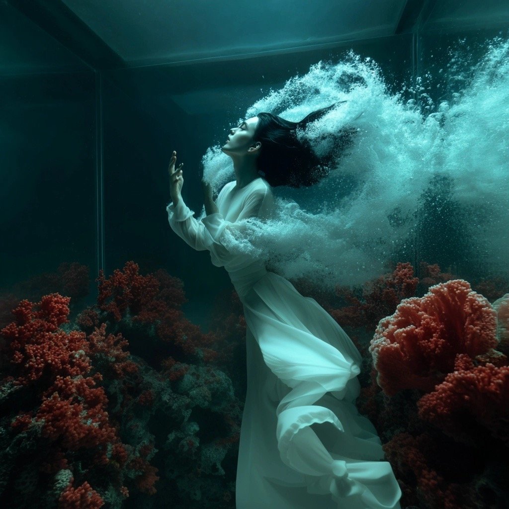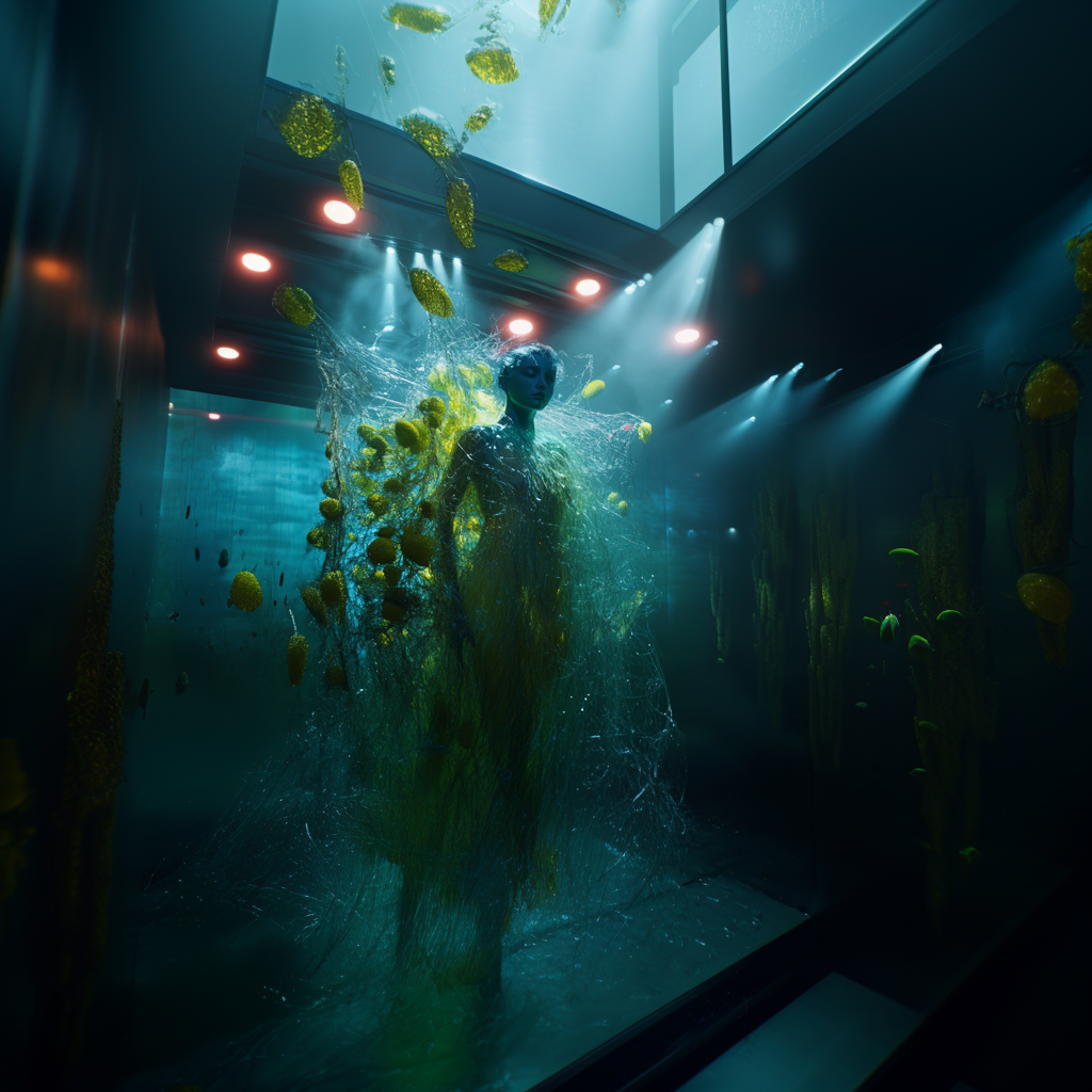 Αντλώντας από μυθολογικά αρχέτυπα των νυμφών του νερού και των πνευμάτων του τόπου, η έκθεση εξερευνά τη θηλυκότητα όχι ως υποκείμενο, αλλά ως μια ακατάλυτη δύναμη που επιβιώνει περισσότερο από τις δομές που χτίστηκαν για να την περιορίσουν. Αυτές οι φασματικές παρουσίες περιηγούνται σε δωμάτια όπου η ανθρώπινη φιλοδοξία έχει διαλυθεί σε κρύα και διαρκώς κινούμενα νερά, εκεί όπου το τεχνητό φως τρεμοπαίζει πάνω στην οργανική ανάπτυξη. Είναι μάρτυρες της παροδικότητας, ενσαρκώσεις αυτού που παραμένει όταν όλα τα άλλα καταρρέουν.